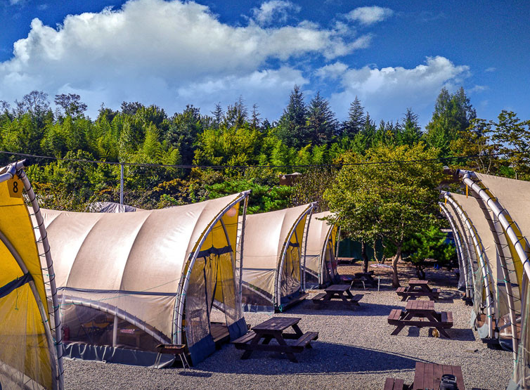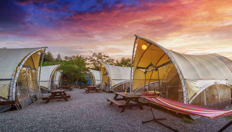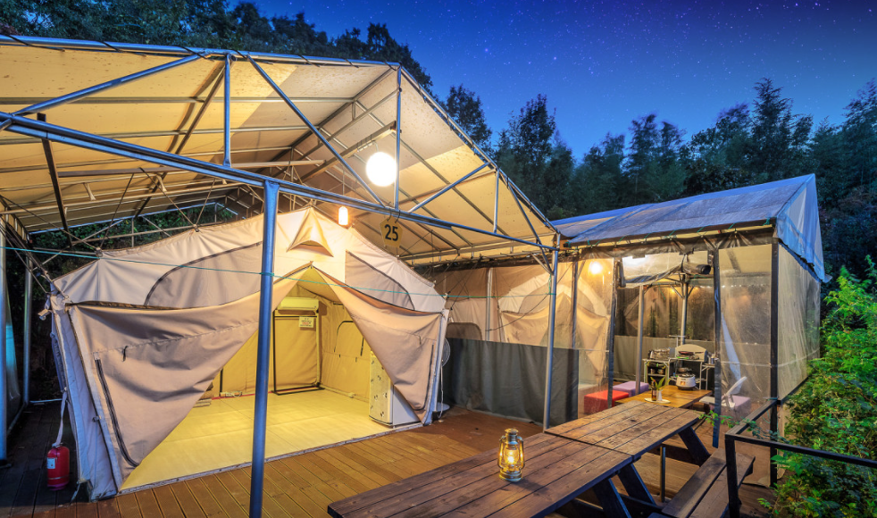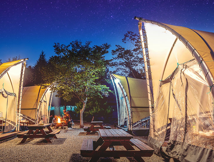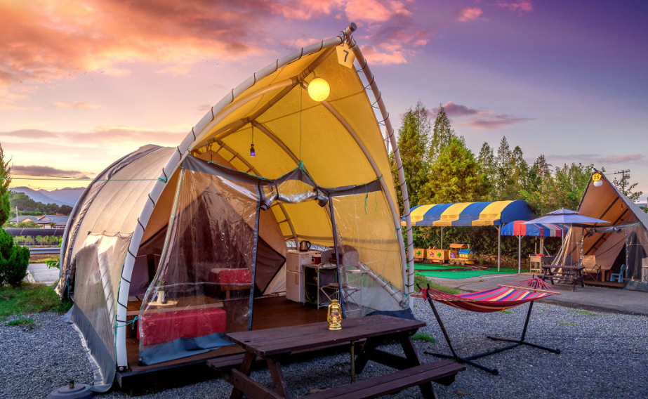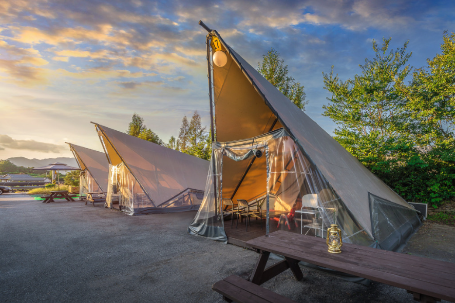 다양한 캠핑 스타일을 지원하여 텐트, 글램핑, 카라반 옵션이 준비되어 있습니다.