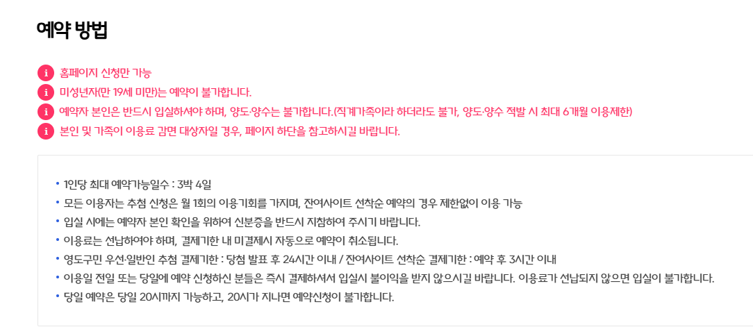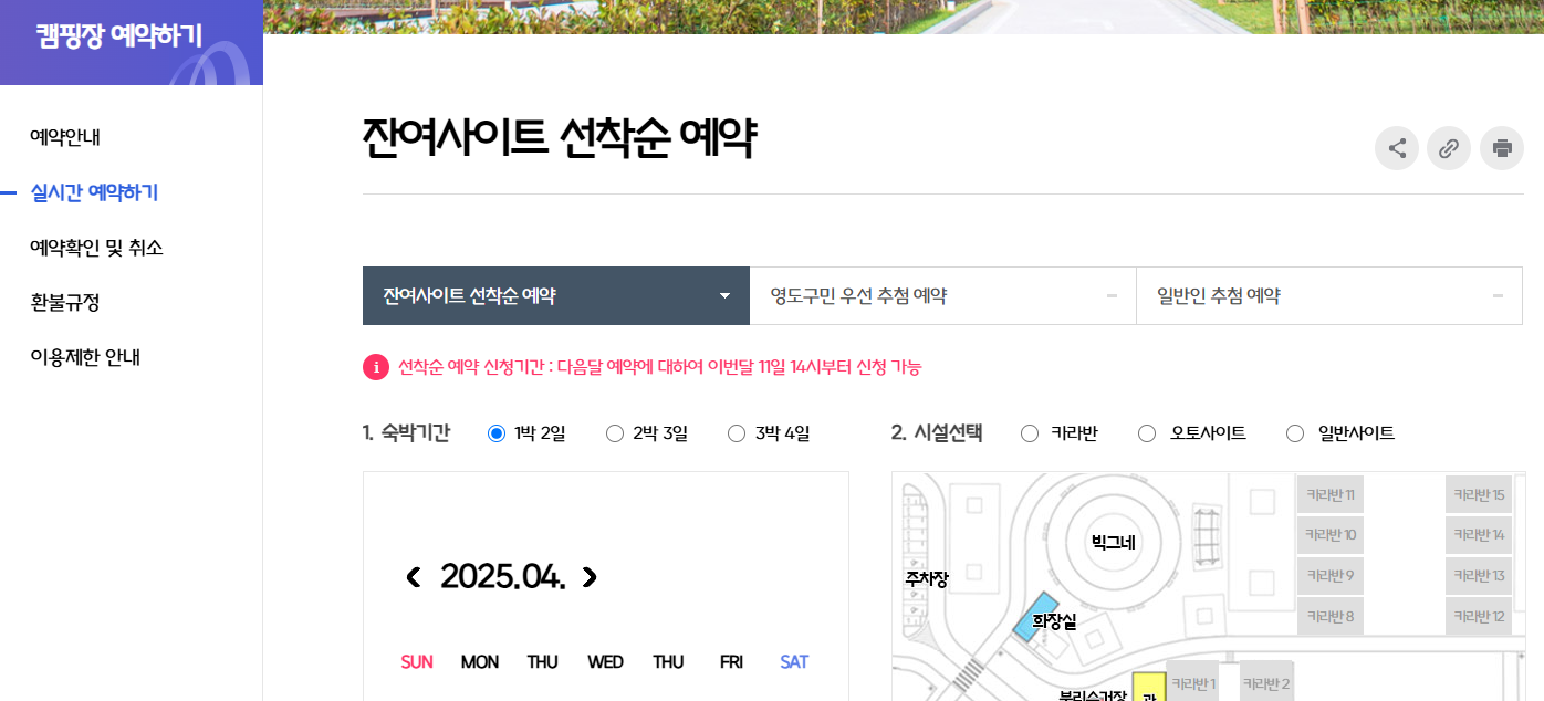 | 잔여 사이트 선착순 예약 | 매월 11일 14시 이후 | 남은 사이트만 가능 |