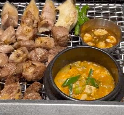 특히 이곳은 왕겨씨를 사용해 고기를 초벌하는 특별한 방식이 정말 인상 깊었어요. 실제로 왕겨씨가 타는 모습을 볼 수 있었는데, 그 향이 고기에 은은하게 스며들면서 깊은 풍미를 더하더라고요. 일반 숯불이나 참숯과는 차원이 다른, 은근한 향이 입안에 맴도는 그 진한 맛.