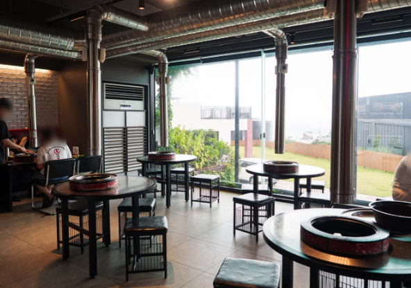 실내에 들어서자마자 가장 먼저 눈에 들어온 건 바다 전망이 시원하게 펼쳐진 통유리창. 바다를 바라보며 고기를 굽는다는 건 상상만 해도 기분 좋은 일이잖아요. 여유롭게 넓은 테이블 배치, 좌석 간 거리도 넉넉해서 가족, 커플, 단체 모임 등 어떤 약속이든 어울릴 장소인 것 같아요.